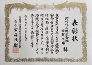 防災活動の取り組みについて表彰状をいただきました。 2026.01.14 TOPICS 滋賀県防火保安協会連合会様よりこれまでの防災活動の取り組みについて表彰状をいただきました。 全従業員にクリスマスプレゼント前の記事
